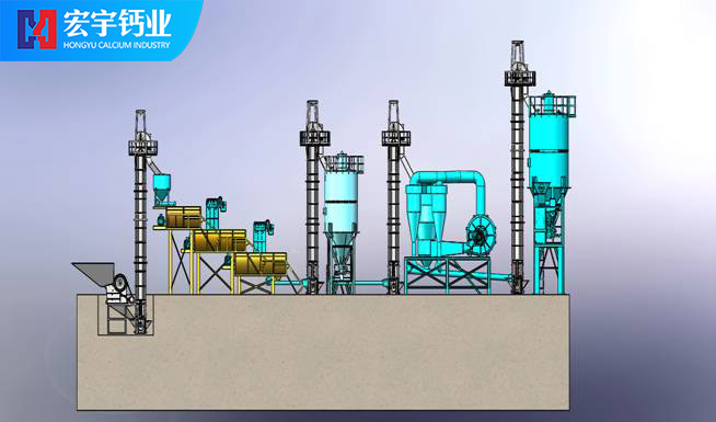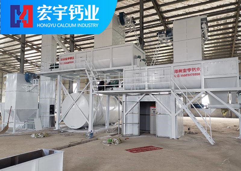 將合格的氧化鈣(CaO)塊料由鄂式破碎機破碎至40mm左右粒度,經(jīng)斗式提升機送入氧化鈣儲存罐料倉,料倉中的氧化鈣經(jīng)穩(wěn)流輸送機定量穩(wěn)重系統(tǒng)進入氫氧化鈣Ⅰ級消化器進行初步消化,當氫氧化鈣完成初級消化以后進入Ⅱ級消化或Ⅲ級消化器,使氧化鈣消化分解,生成合格的氫氧化鈣初級產(chǎn)品,消化率達到98%,(消化系統(tǒng)根據(jù)產(chǎn)能要求,機型設(shè)計分為單軸、雙軸及多軸機型)。消化分解好的氫氧化鈣再由半成品螺旋輸送機送入選粉機內(nèi),由選粉機完成產(chǎn)品雜質(zhì)分離和細度分級,完成分級后的終端合格產(chǎn)品,由成品輸送機、提升機卸入成品氫氧化鈣罐倉進行分別包裝。本套生產(chǎn)線所有污染節(jié)點由脈沖除塵器完成,收塵率達到99.5%。
